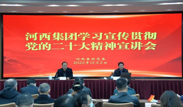 根據(jù)中央和省市委、市國資委黨委部署要求,12月2日下午,河西集團(tuán)召開學(xué)習(xí)宣傳貫徹黨的二十大精神宣講會(huì),邀請市委宣講團(tuán)成員、市委黨??蒲刑幪庨L高信奇教授做專題宣講,進(jìn)一步引導(dǎo)集團(tuán)廣大黨員干部職工全面深入學(xué)習(xí)宣傳貫徹黨的二十大精神,切實(shí)把思想和行動(dòng)統(tǒng)一到黨的二十大精神上來,更加深刻領(lǐng)悟“兩個(gè)確立”的決定性意義,不斷增強(qiáng)“四個(gè)意識”、堅(jiān)定“四個(gè)自信”、做到“兩個(gè)維護(hù)”。會(huì)議由集團(tuán)黨委副書記、董事繆昌根主持。集團(tuán)領(lǐng)導(dǎo)、全體中層干部及集團(tuán)下屬各公司黨務(wù)工作者參加會(huì)議。