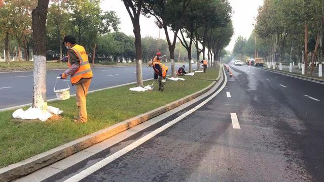 公司嚴(yán)格要求刷白“精細(xì)化”養(yǎng)護(hù)標(biāo)準(zhǔn),首先根據(jù)喬木、花卉類(lèi)樹(shù)木的特性,區(qū)別了刷白高度;其次,在刷白時(shí)采取了墊襯措施,確保地面和地被植物干凈美觀;最后,按照止口平整,高度一致,刷白均勻,不留死角的要求,在城區(qū)多主干道和公園同時(shí)開(kāi)展刷白工作。