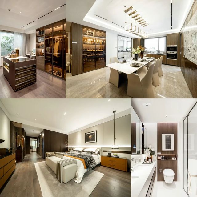 此次公開的樣板間為265㎡奢華四房兩廳三衛(wèi)雙陽臺(tái)戶型,在戶型研發(fā)和飾面材料使用上,設(shè)計(jì)團(tuán)隊(duì)都針對(duì)主要客戶人群的需求,經(jīng)過反復(fù)斟酌,對(duì)細(xì)節(jié)處理更是精益求精,成為奧體公司迭新之作。硬朗的石材紋理與沉穩(wěn)的木飾面碰撞出豐富的層次變化,加上墻面局部銅制捶打紋飾面和內(nèi)嵌式金屬開關(guān)面板,營造低調(diào)奢華的現(xiàn)代風(fēng)格。